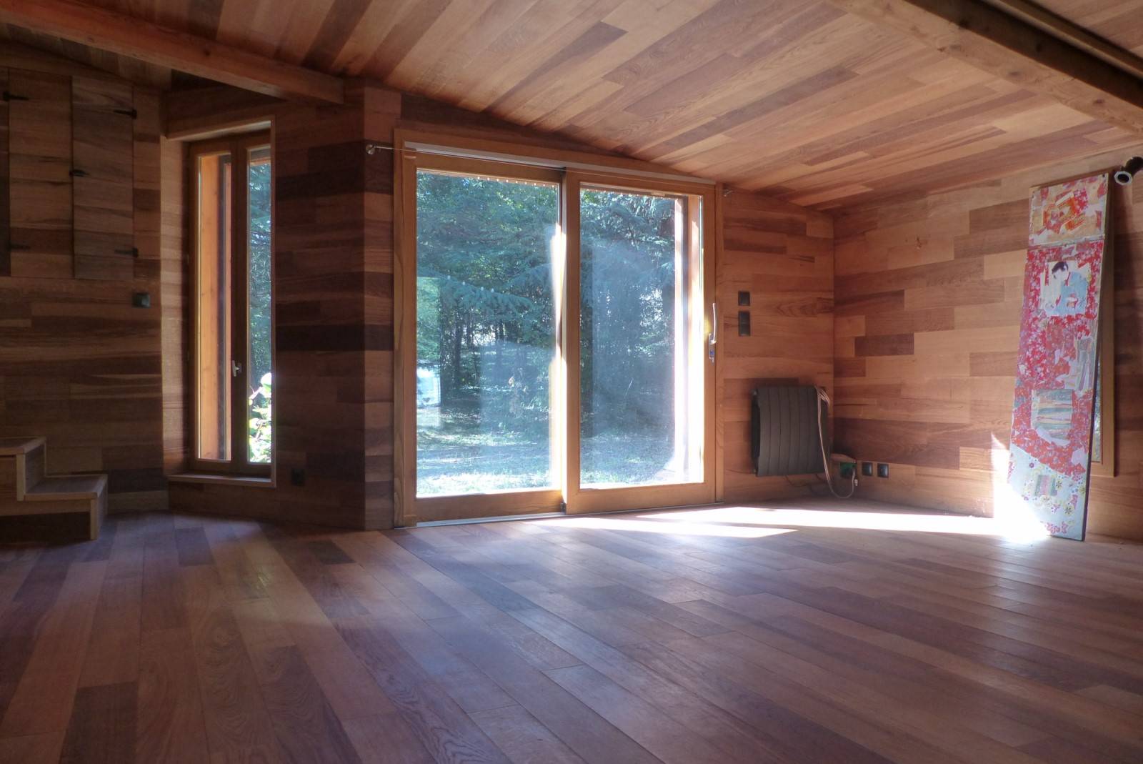 Elle est composée d'une pièce de vie avec cuisine ouverte, d'un salon, d'une grande chambre avec baie vitrée en rez de jardin, d'une mezzanine avec coin bureau et de 2 chambres à l'étage.